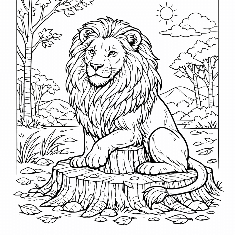 Free printable lion coloring page for kids. A Lion Resting Under An Acacia Tree At Sunset. Print in one click, Level: advanced.