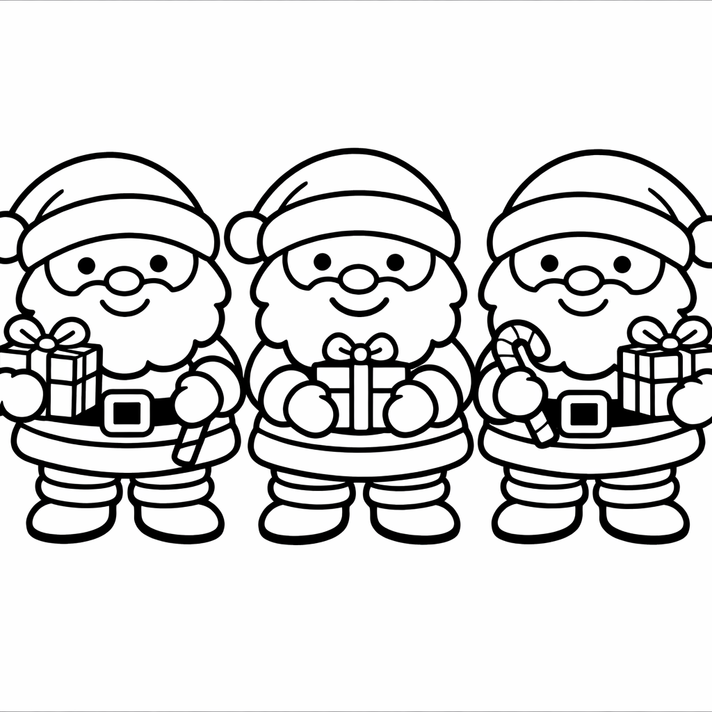 Santa Claus Coloring Page — Object Only: Two Or Three Santa Clauss Side By Side, Simple And Adorable, No Background