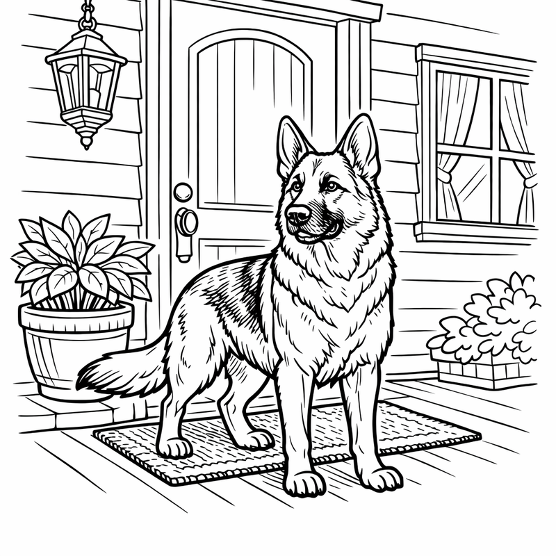 Free printable german shepherd coloring page for kids. A German Shepherd Standing Guard At A Front Door. Print in one click, Level: beginner.