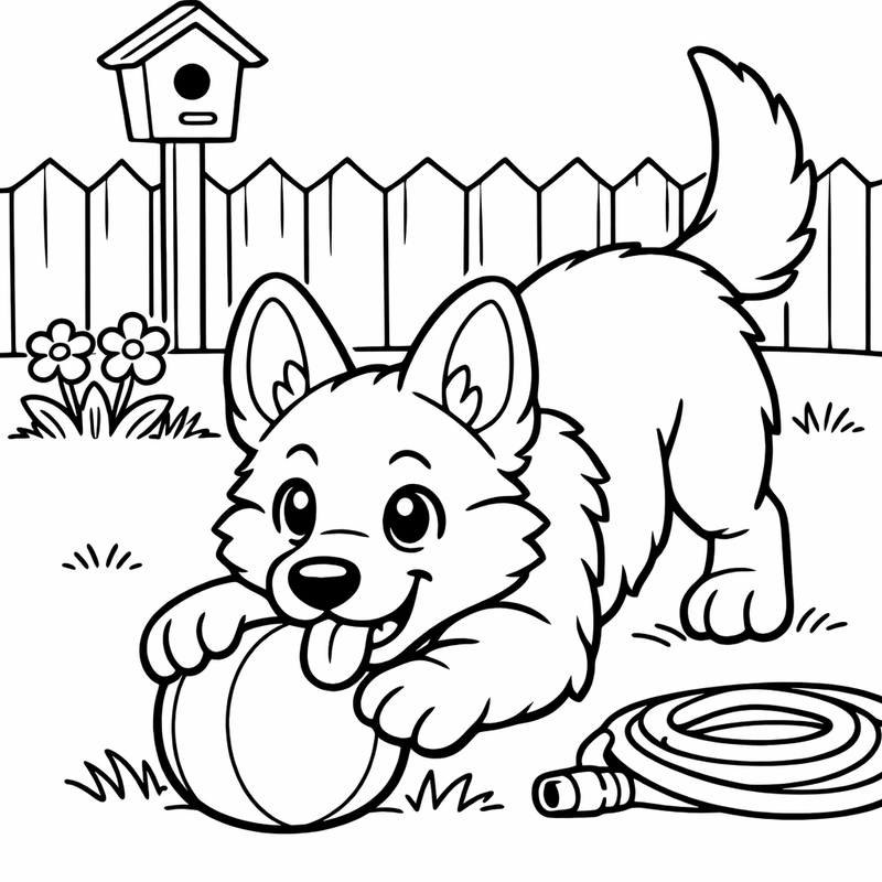 German Shepherd Coloring Page — A German Shepherd Puppy Playing With A Ball In A Yard