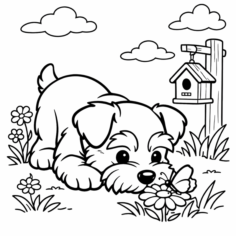 Free printable schnauzer coloring page for kids. A Miniature Schnauzer Puppy Running Through Grass. Print in one click, Level: beginner.