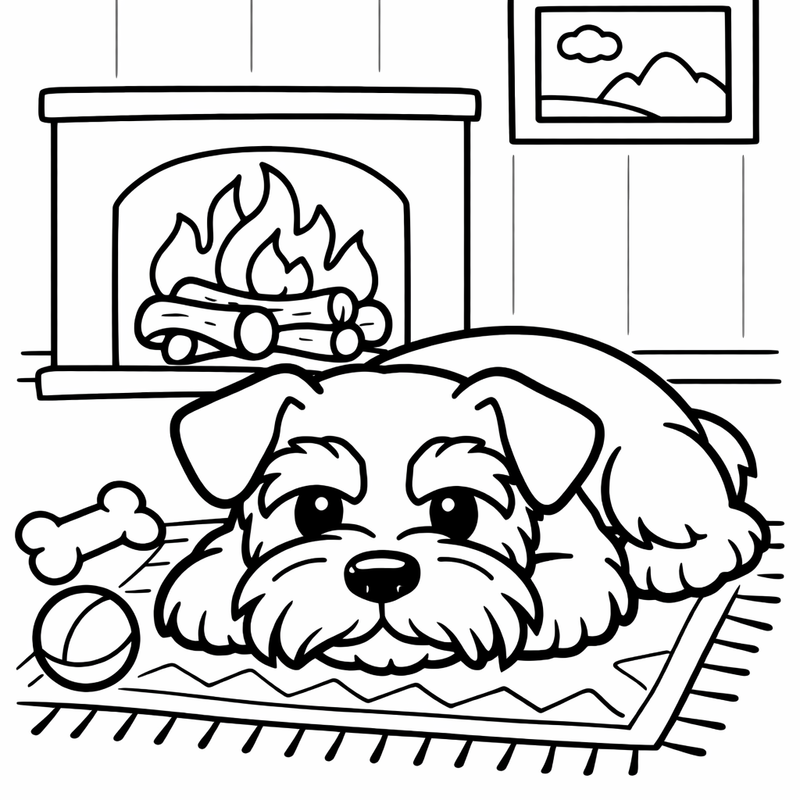 Schnauzer Coloring Page — A Schnauzer Lying By A Fireplace On A Rug