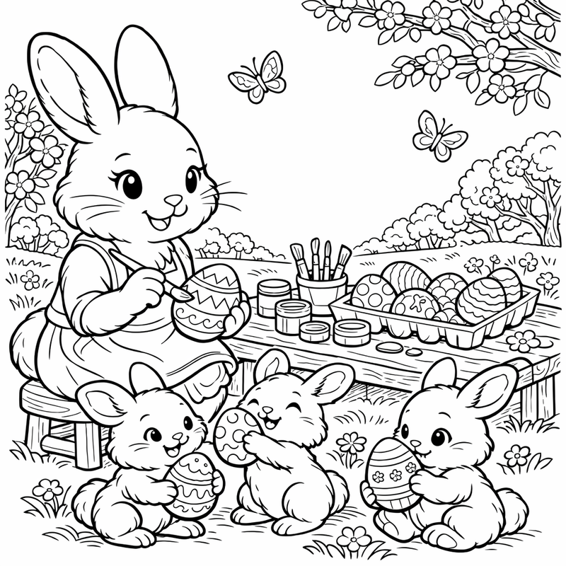 Bunny Family Coloring Page — A Bunny Family Painting Easter Eggs Together