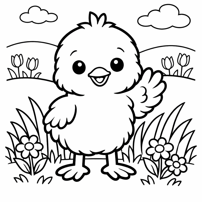 Chick Coloring Page — A Fluffy Yellow Chick Standing In Green Grass