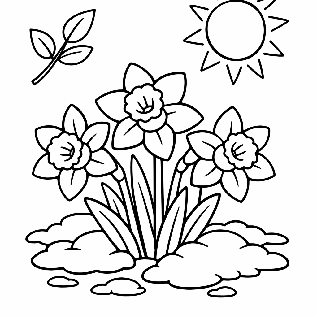 Free printable daffodil coloring page for kids. A Cluster Of Daffodils Pushing Up Through Melting Snow In Early Spring. Print in one click, Level: beginner.
