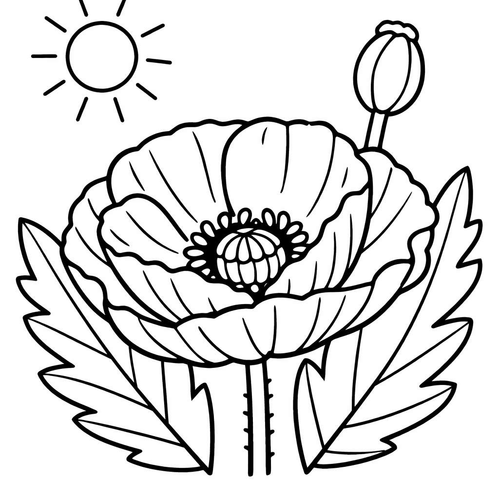 Free printable poppy coloring page for kids. Object Only: Three Poppies At Different Stages — Bud, Blooming, And Seed Pod, No Background. Print in one click, Level: beginner.