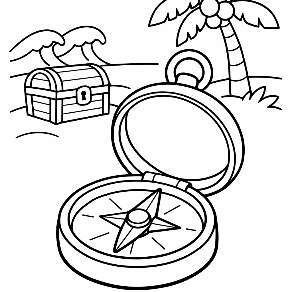 Free printable compass coloring page for kids. Compass And Treasure. Print in one click, Level: beginner.