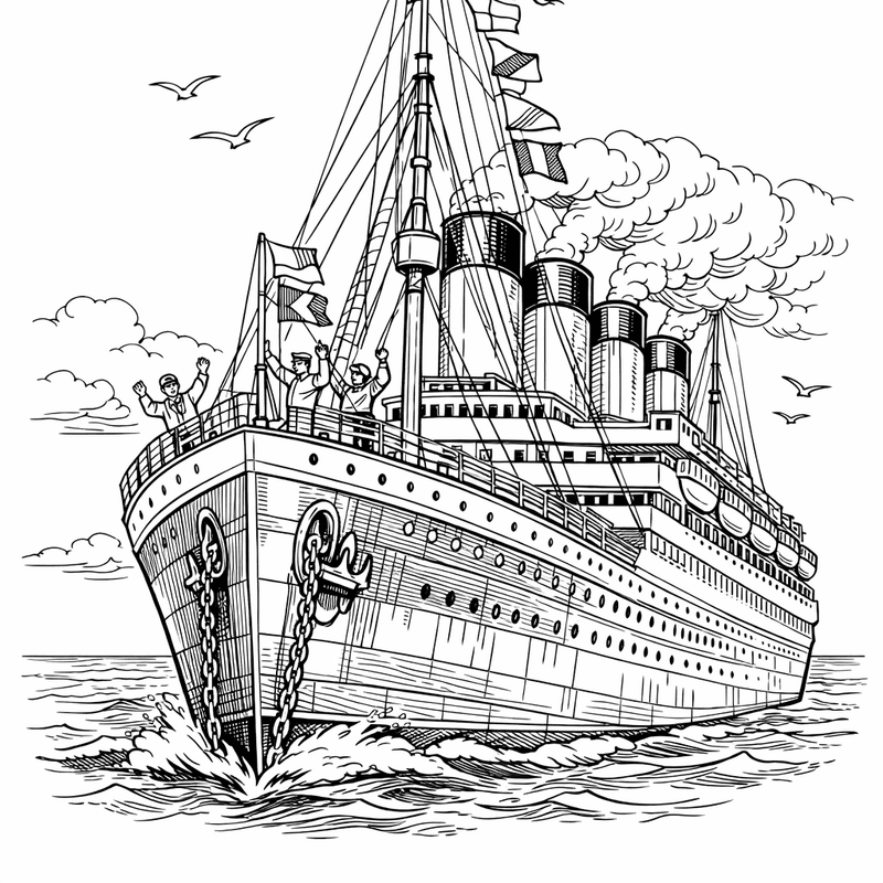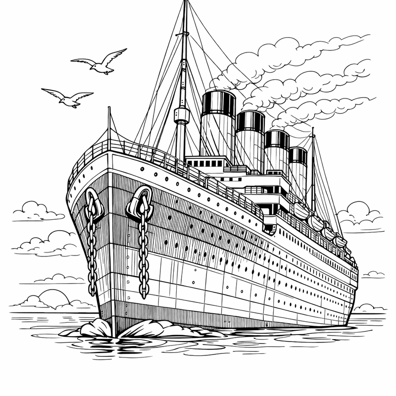 Free printable titanic coloring page for kids. Titanic Side View With Four Funnels. Print in one click, Level: beginner.
