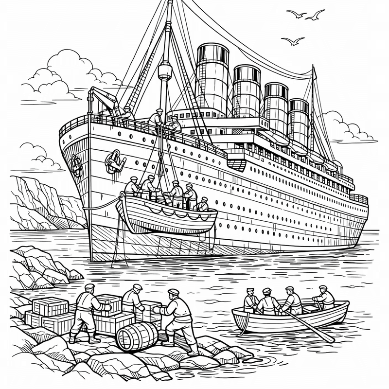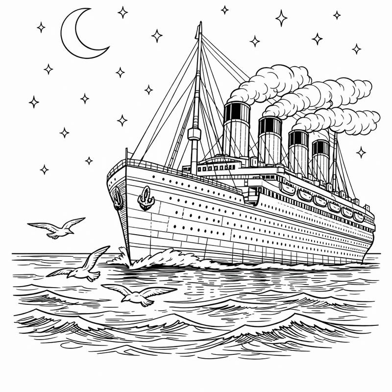 Titanic Coloring Page — Titanic Side View With Four Funnels