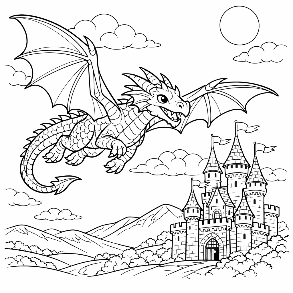 Dragon Coloring Page — A Dragon Flying Over A Castle With Small Wings