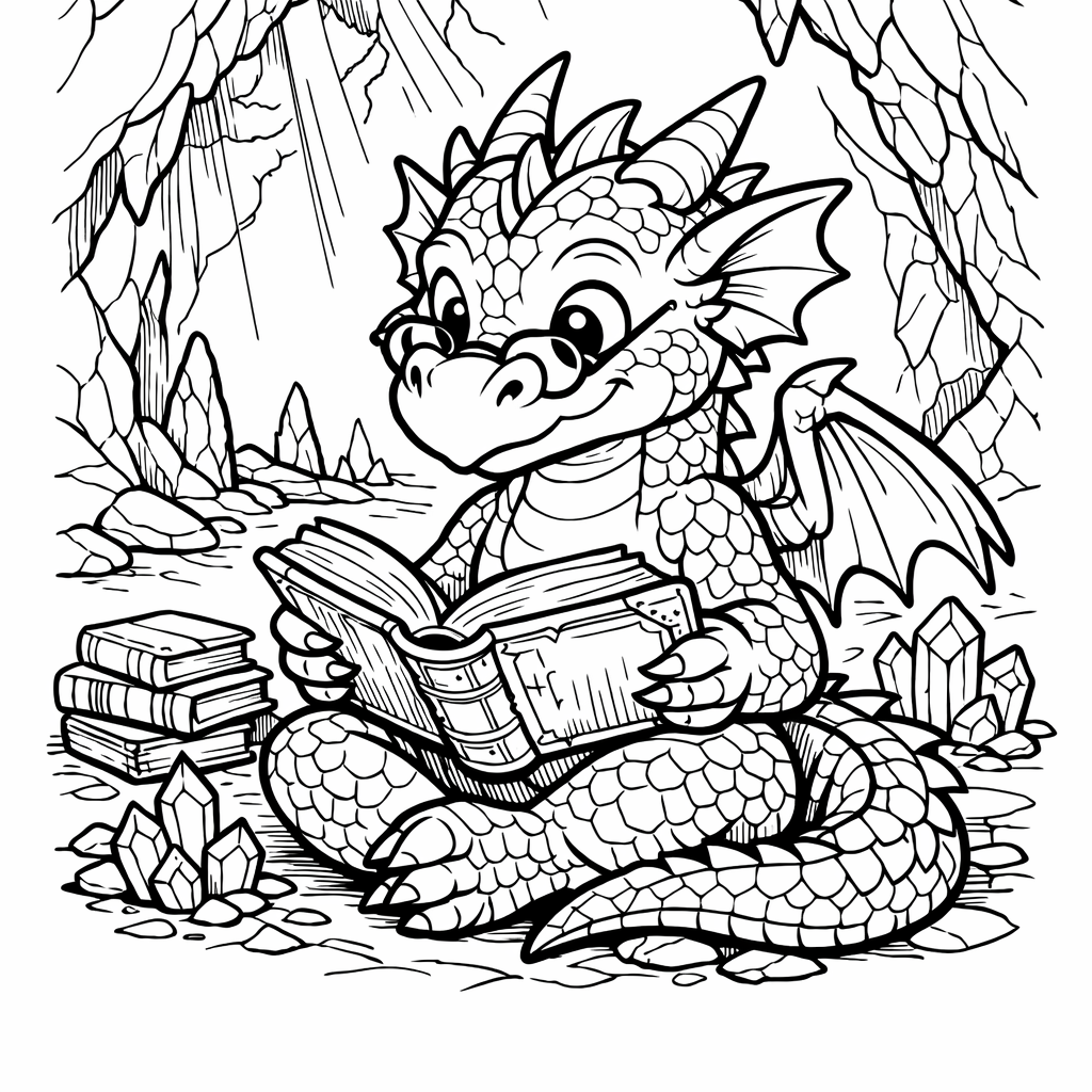 Dragon Coloring Page — A Friendly Dragon Reading A Book In Its Cave