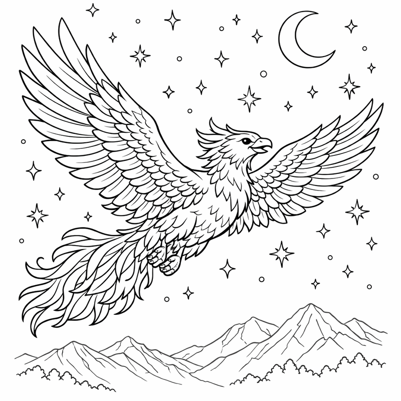 Free printable phoenix coloring page for kids. A Phoenix Flying Across A Starry Sky. Print in one click, Level: advanced.