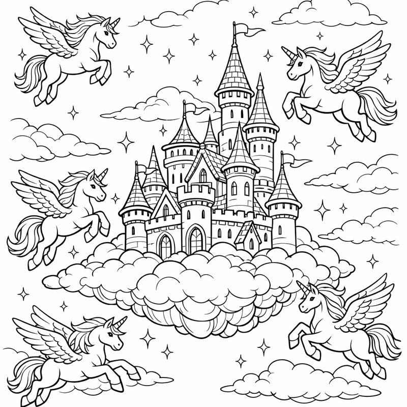 Unicorn Castle Coloring Page — A Floating Castle In The Clouds With Unicorns Flying Around