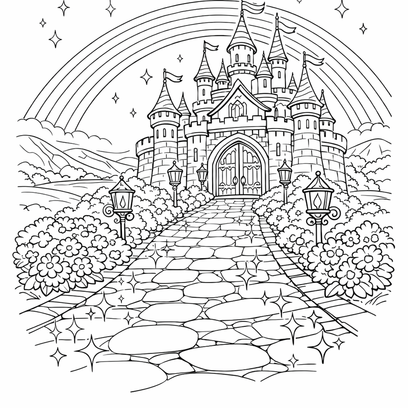 Unicorn Castle Coloring Page — A Rainbow Leading To A Sparkling Unicorn Castle