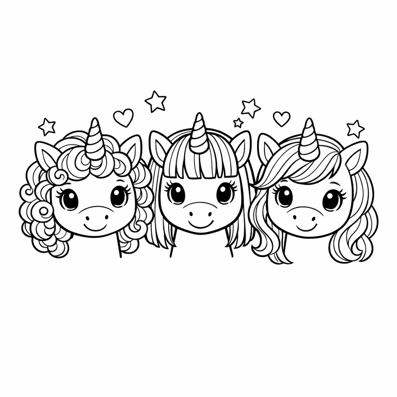 Unicorn Head Coloring Page — Object Only: Two Or Three Unicorn Heads Side By Side, Simple And Adorable, No Background